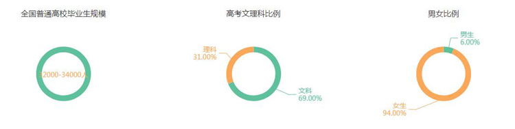 学前教育专业每年全国普通高校毕业生规模在32000-34000人;2017年全国就业率在90%-95%之间;文理科比例:文科69%,理科31%;男女比例为:男生占6%,女生占94%。