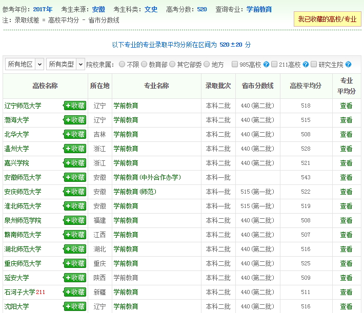 2017年部分高校学前教育专业的录取分数