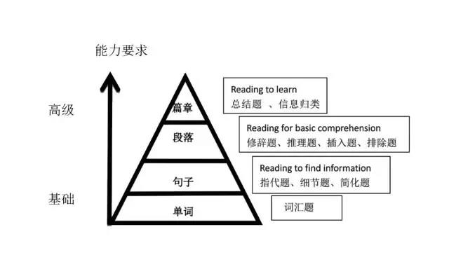 我们先来一起探寻托福阅读本身的奥秘,(如上图所示),托福文章由初级的词汇题到总结题,信息归纳题等10 个不同的题型其实正是对应了从单词、句子、段落到篇章不同级别的难度要求,对学生的能力要求也是逐级递增的。学习了托福阅读本身的出题特点后可以鲜明的推断出其结构性强,学术型强的特点。