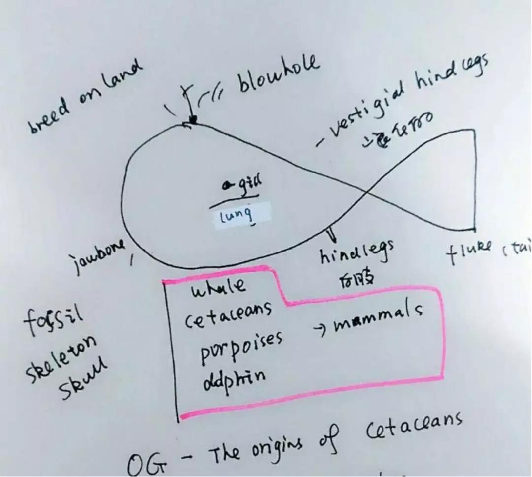 咱们拿 OG 里 的 Cetaceans 来说吧,讲的是鲸鱼的起源,词汇有涉及 mammal/cetacean/fossil/gill/breed 等重点生物类词 汇。此时你可以摊开你的笔记本,画下一头鲸鱼(如图所示),然后把老师啰嗦了好几遍的非常重要的词去写在画上。