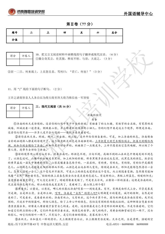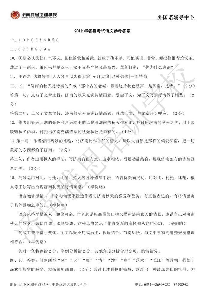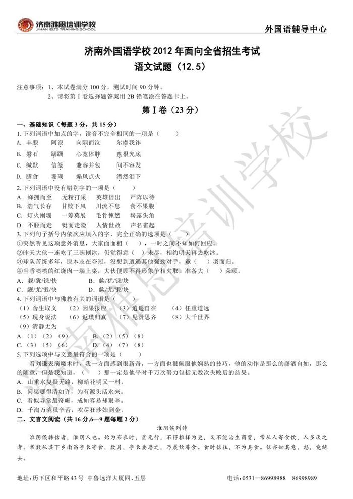 2012年济南外国语学校省招保送招生考试语文试题