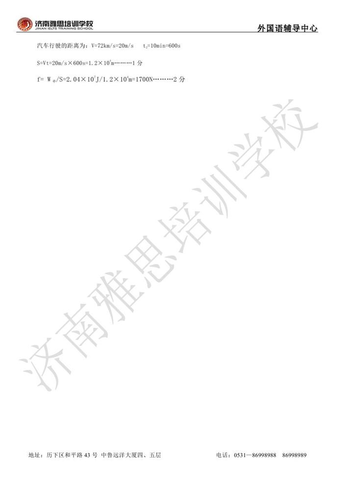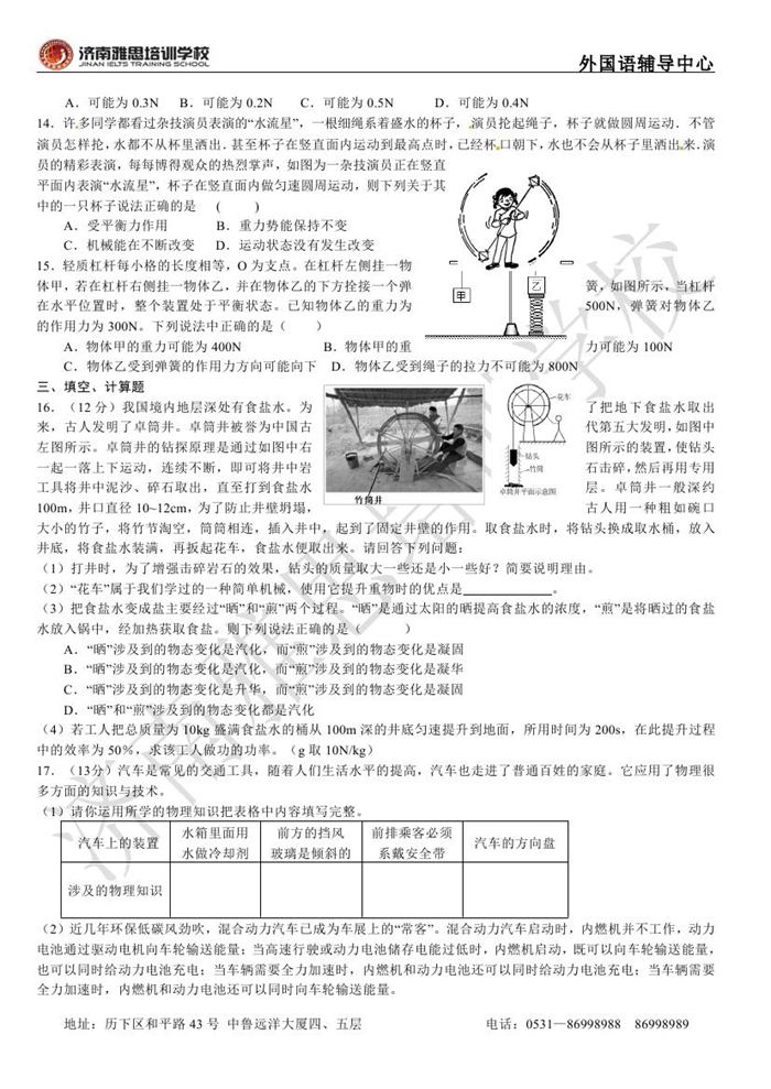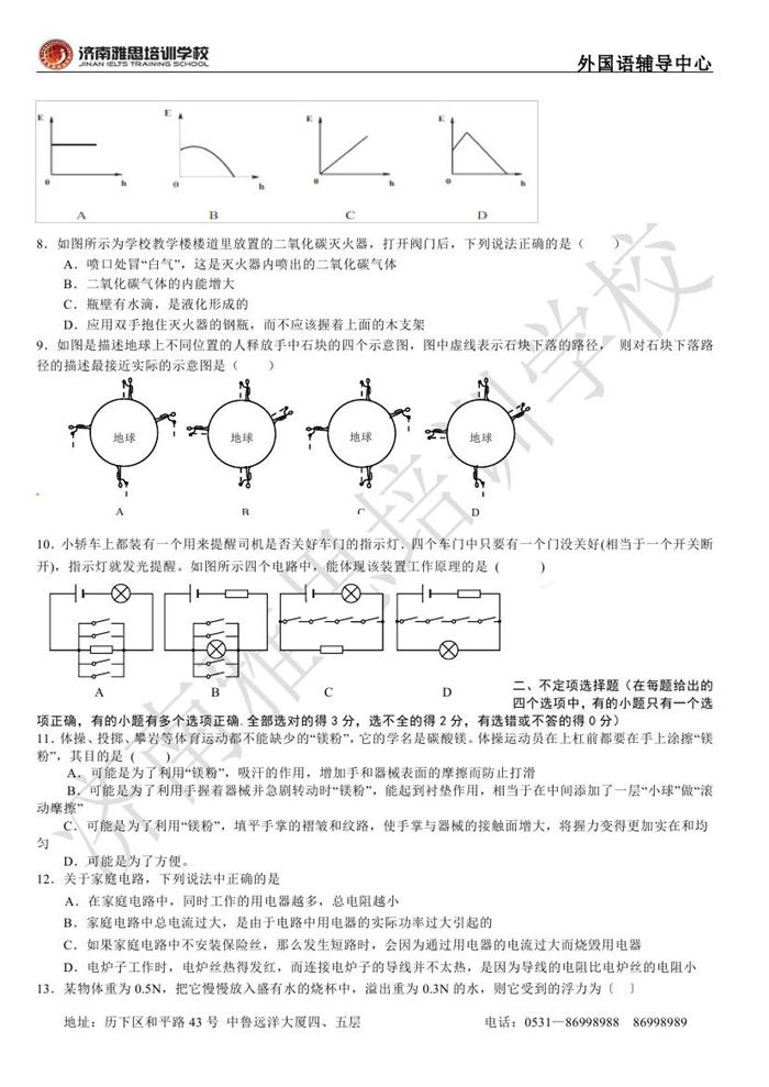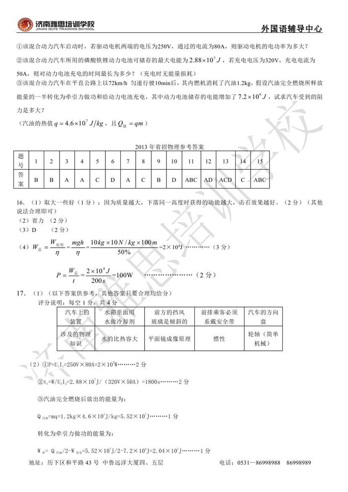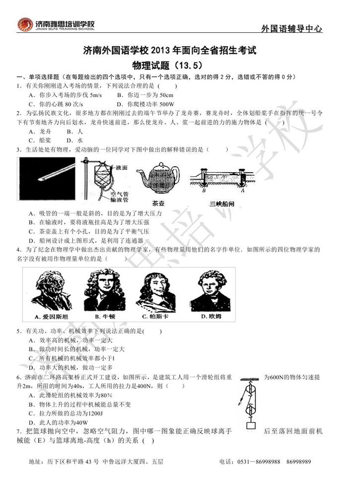 2013年济南外国语学校省招保送招生考试物理试题