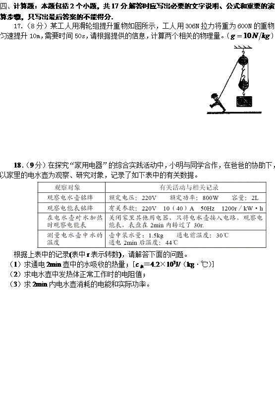15.如图所示。(正确画出通电螺线管磁极1分,正确画出小磁针磁极2分) 16.①70 ②2.5×103 偏小 ③C (每空2分) 四、计算题:本题包括2个小题,共17分.解答时应写出必要的文字说明、公式和重要的演算步骤,只写出最后答案的不能得分. 17、W有=6000J W总=6120J P=122.4W (计算出任意两个即可,每个4分) 18、解:(1)通电2min壶中水吸收的热量:Q吸=c水m水(t-t0) =4.2×103J/(kg·℃)×1.5kg×(44℃-30℃)=8.82×104J(3分) (2)由P=UI=U2/R 可得 (1分) 电水壶发热体正常工作时的电阻值R=U2/P=(220V)2/(800W)=60.5Ω (2分) (3)电水壶2min内消耗的电能: W= 电水壶的实际功率: P= |