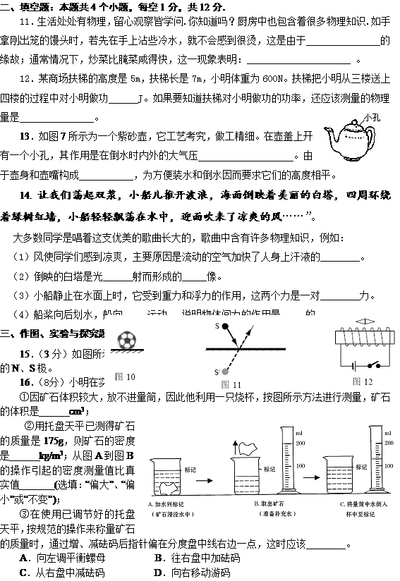 二、填空题:本题共4个小题,每空1分,共12分. 11、蒸发吸热 温度越高,扩散越快 12、3000 时间 13、相同 连通器 14(1)蒸发 (2)反 虚 (3)平衡力 (4) 前 相互 三、作图、实验与探究题:本题包括2个小题,共11分. 15.如图所示。(正确画出通电螺线管磁极1分,正确画出小磁针磁极2分) 16.①70 ②2.5×103 偏小 ③C (每空2分) 四、计算题:本题包括2个小题,共17分.解答时应写出必要的文字说明、公式和重要的演算步骤,只写出最后答案的不能得分. 17、W有=6000J W总=6120J P=122.4W (计算出任意两个即可,每个4分) 18、解:(1)通电2min壶中水吸收的热量:Q吸=c水m水(t-t0) =4.2×103J/(kg·℃)×1.5kg×(44℃-30℃)=8.82×104J(3分) (2)由P=UI=U2/R 可得 (1分) 电水壶发热体正常工作时的电阻值R=U2/P=(220V)2/(800W)=60.5Ω (2分) (3)电水壶2min内消耗的电能: W=×3.6×106J/(kW·h)=9×104J (2分) 电水壶的实际功率: P===7.5×102W (1分) |